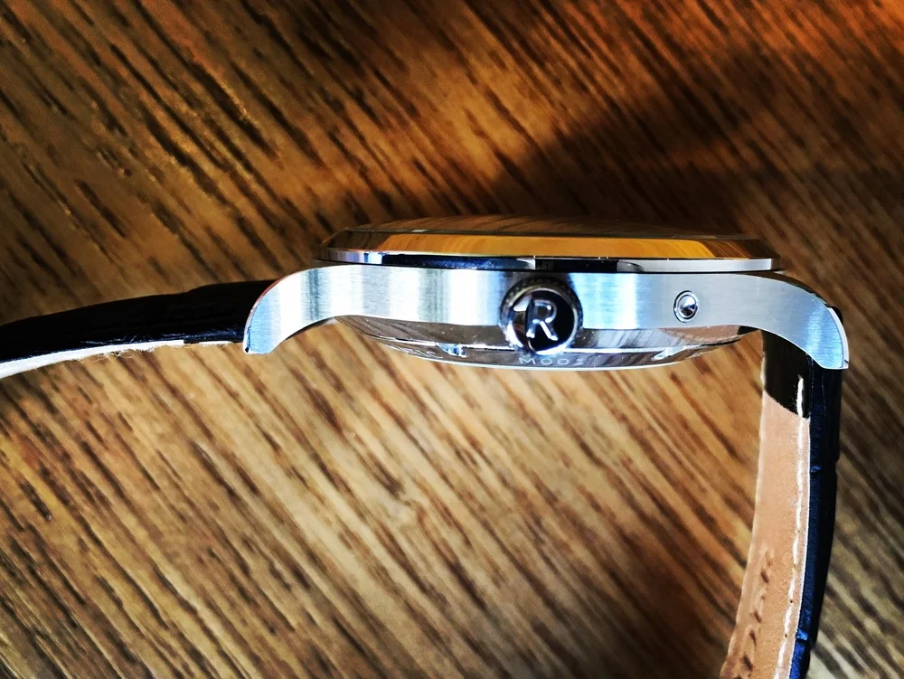 大部分拉丝的表壳,抛光的表圈,标准的黑色皮带。环顾我办公室的手表,我发现有些价位相似的手表用的是相同表带,所以我认为这一范围的品牌可以通过提升皮带品质的办法来把自己与其他品牌区别开来,或者至少是以稍加大胆的方式。