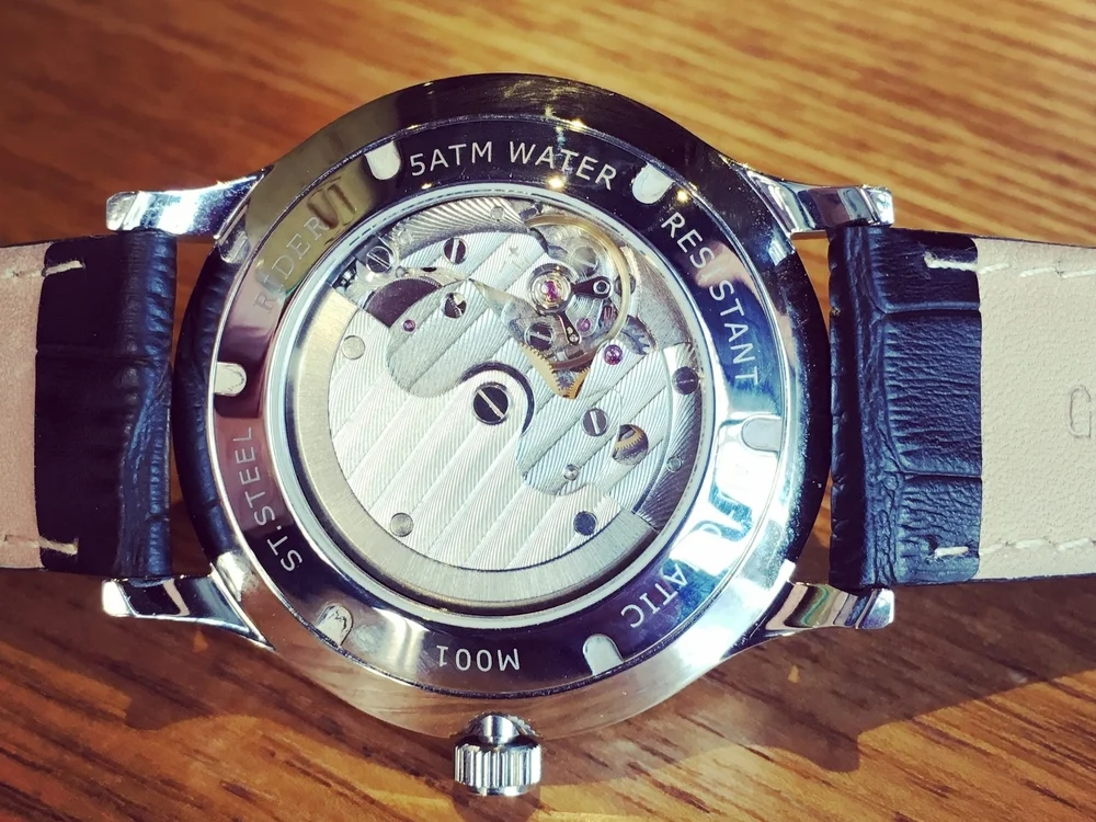 三个小眼的指针是蓝色的,也是整个字面上独有的蓝色,字面本身的太阳纹设计让手表整体看起来更加帅气。底盖有机芯的透视窗,天津海鸥ST1780机芯,机器加工的零件。对我而言,手表走时不错,此价位你可以预期它每天有+/- 30秒的误差,有些人做过测试后发现其实结果比这要好得多。