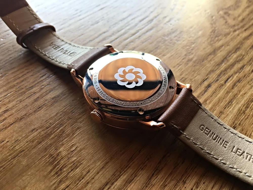 在同类型的半智能领域中,更为实惠的表当属天霸的T-Watch。天霸是一个来自深圳有着30多年的品牌,根据其网页显示,天霸于1982年制作了第一枚石英手表,它是中国最早生产石英腕表的品牌之一。天霸还生产了许多不同类型的机械表,并赋予它具有魅力的名字“王者”,勇敢和美的象征。我正戴着的这款手表气质典雅,字面洁白,表壳、表针和表扣都是玫瑰金色。表带提供不同的选择,我这款安装了柔软的棕牛皮带,还有抛光的实心钢带和迷人的钢网带。表壳尺寸为40mm x 11.8mm,人工蓝宝石镜面好像是经过了抗反射处理,几乎无论从哪个角度看去都有着很好的视觉。